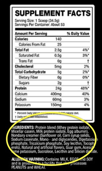 What you'll realize when you take a close look at protein powder labels is that 99% of the protein powder blends sold on the market today do not list the exact amount of each one of those proteins. All they list is the total amount of protein in the Supplement Facts panel. In the "Ingredients" list (image below) you will find each type of protein used, but that's it. All they tell you is the type of protein used, but not the amount of each one.