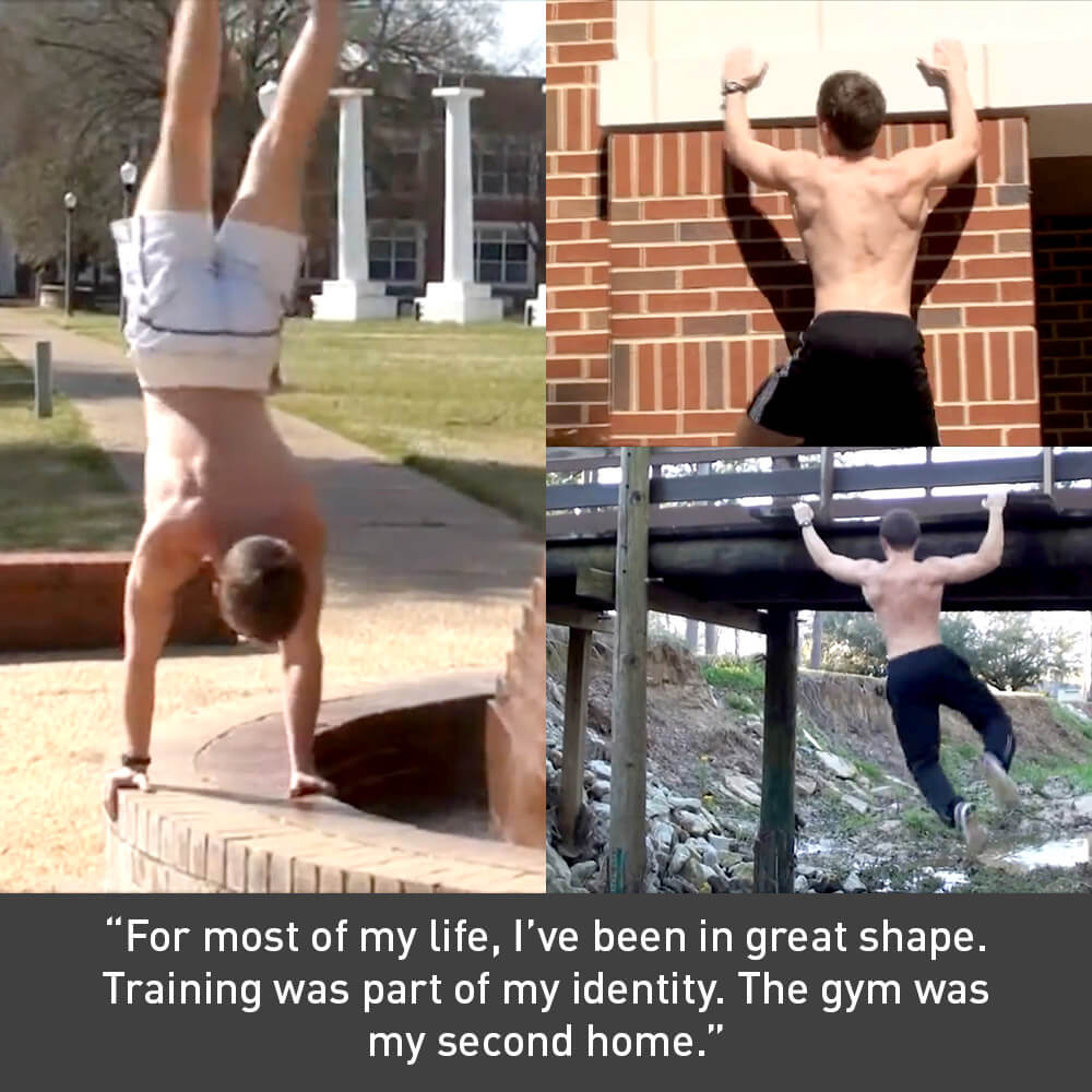 “For most of my life, I’ve been in great shape,” he says, and that’s an understatement. He’s competed on American Ninja Warrior, lined up at a World Championship obstacle course race, finished an Ironman triathlon, and even spent years working as a personal trainer. Training was part of his identity. The gym was his second home.