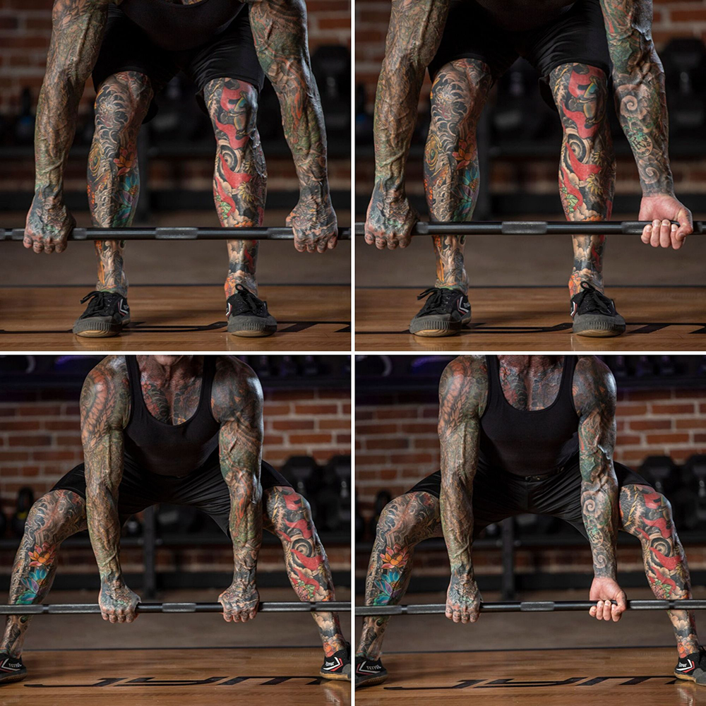 Regardless of the type of deadlift you are doing, I highly suggest that you hold the bar using a staggered grip. This is also known as an alternate grip and involves using an overhand grip with one hand and an underhand grip with the other. This will prevent the bar from rolling out of your hands and will significantly increase your grip strength on the bar.